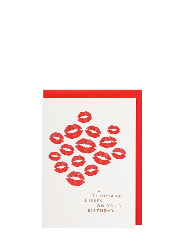 Letterpress greetings card featuring 15 red lipstick kisses and the words 'A thousand kisses on your birthday.'