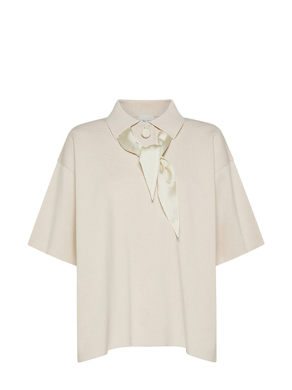 Maxi polo in cotton fabric stitch with a wide volume on the bust and dropped shoulders. The satin scarf inserted in the collar can be detached with a simple gesture thanks to the rear bijoux button. Versatile and urban, this polo is an easy—chic alternative to the shirt, made from compact jersey with a rich, structured feel.