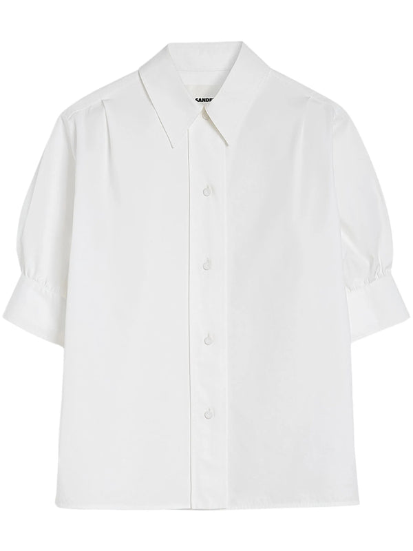 White structured poplin shirt with short sleeves in a slight balloon shape. Stand collar with front buttons and a sleek finish. Jil Sander AW25 Cruise collection.