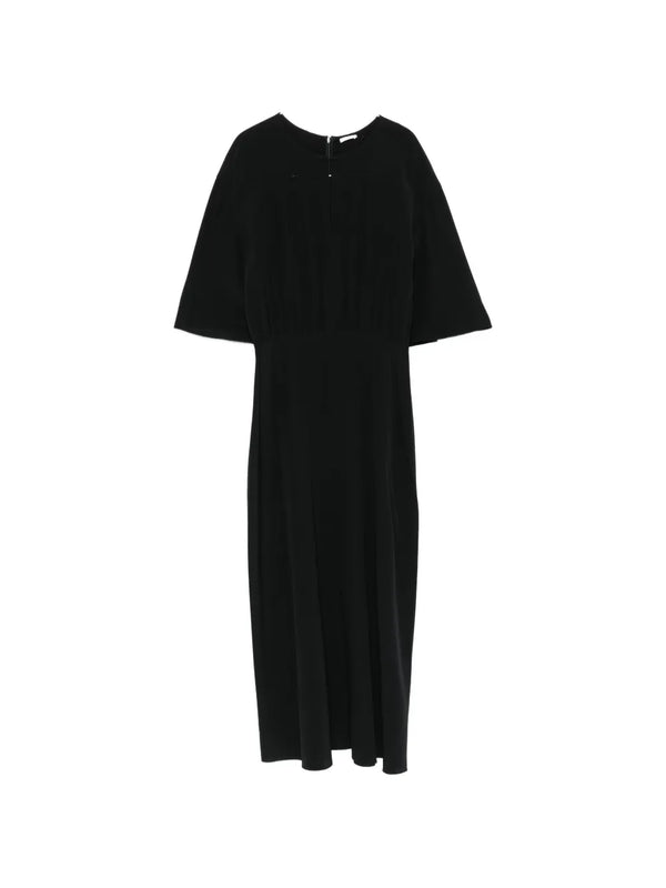 The Silsila Crepe de Soie Silk Dress is a fit to flare, draped style, crafted from lightweight silk. This elegant piece creates a flattering silhouette with its gathered waistline. A front split adds definition and enhances the dress’s fluidity.