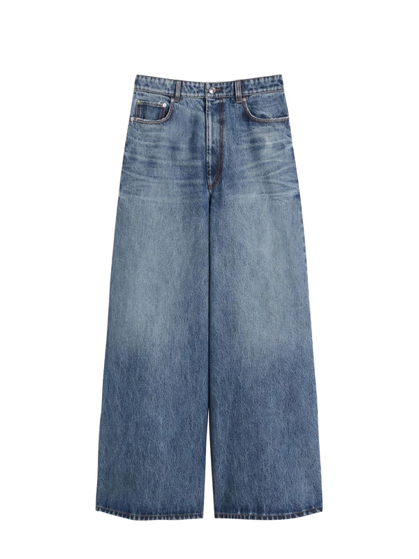 Authentic, non-stretch indigo denim jeans with a dark, clean, medium vintage treatment. The new oversized volume jeans are made from non-stretch indigo denim. The low waist and crotch, combined with a wide-leg fit, create a modern silhouette.