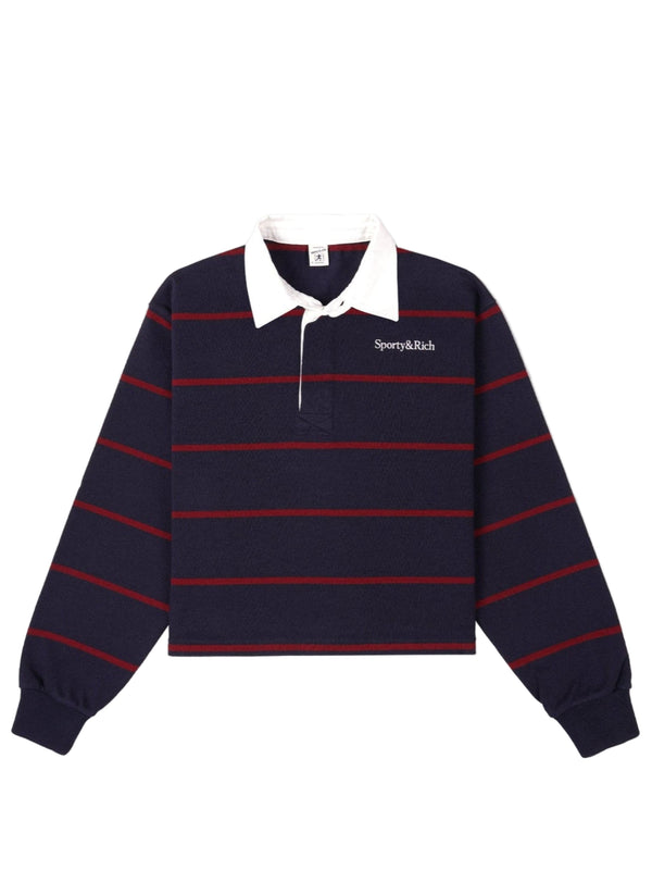 Navy rugby shirt with red stripes and white collar on a light gray background
