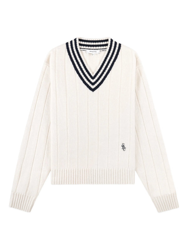 Sporty & Rich cableknitted cashmere sweater in classic cricket style with a contrasted navy striped v-neck.