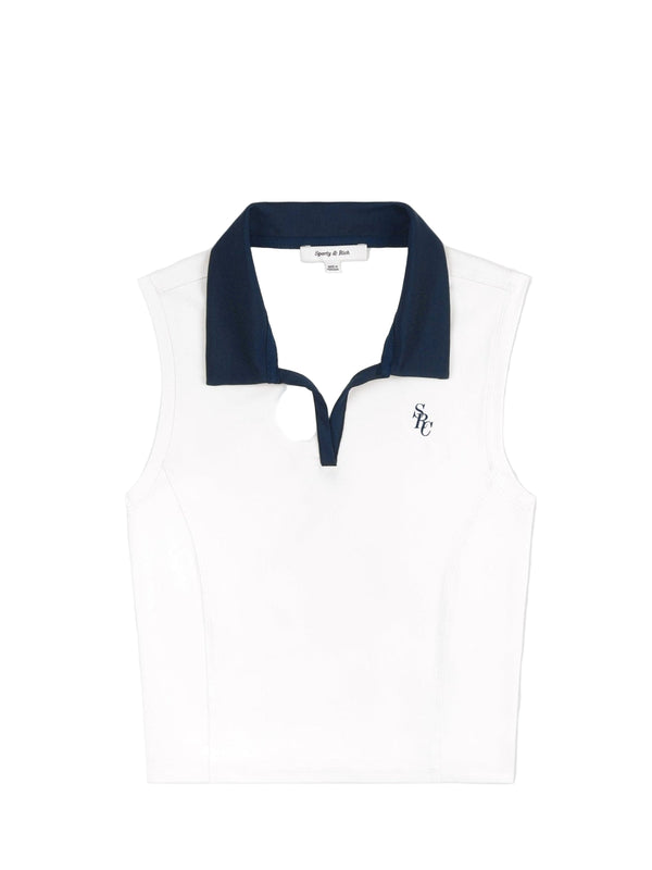 White sleeveless polo shirt with navy collar on a white background