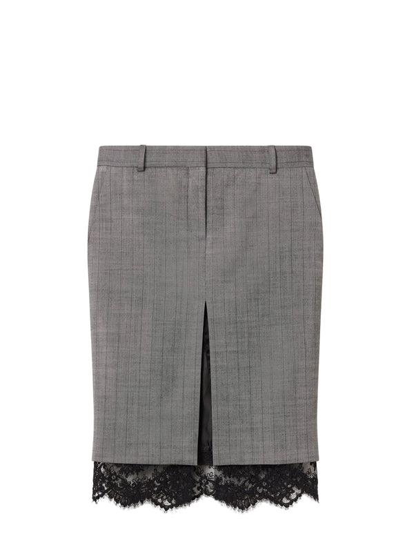 Savile Row tailoring is foundational to the Stella Corp wardrobe, embodying Stella McCartney’s signature masculine-yet-feminine perspective. For Winter 2025, this skirt is immaculately constructed from fully traceable RWS certified wool, topped with a floral lace trim. Pair it with the coordinating blazer for a head-to-toe runway look.