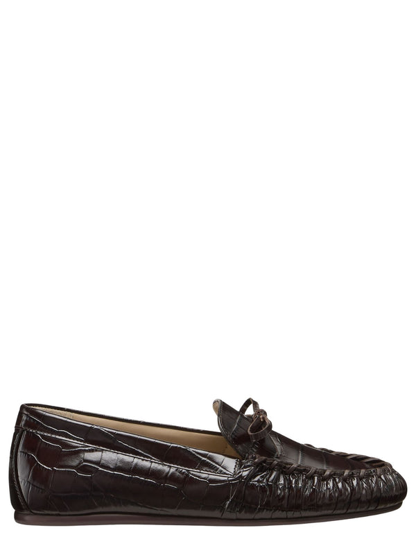 The Britt bow loafer delivers Stuart Weitzman's take on the classic loafer in a beautiful walnut brown colour leather in croco style finish. It is made in Spain with a delicate bow accent, softly gathered details around the toe and a flat block heel for wear-all-day comfort.