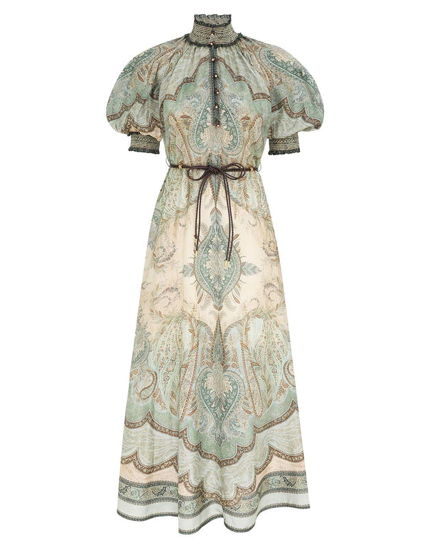 The Wanderlust Billow Dress in Tapestry Teal Multi from Zimmermann's Resort Swim 2026 Collection. A silk maxi dress featuring a shirred stand collar, short billowed sleeves, finished with functional side pockets and frill trim.