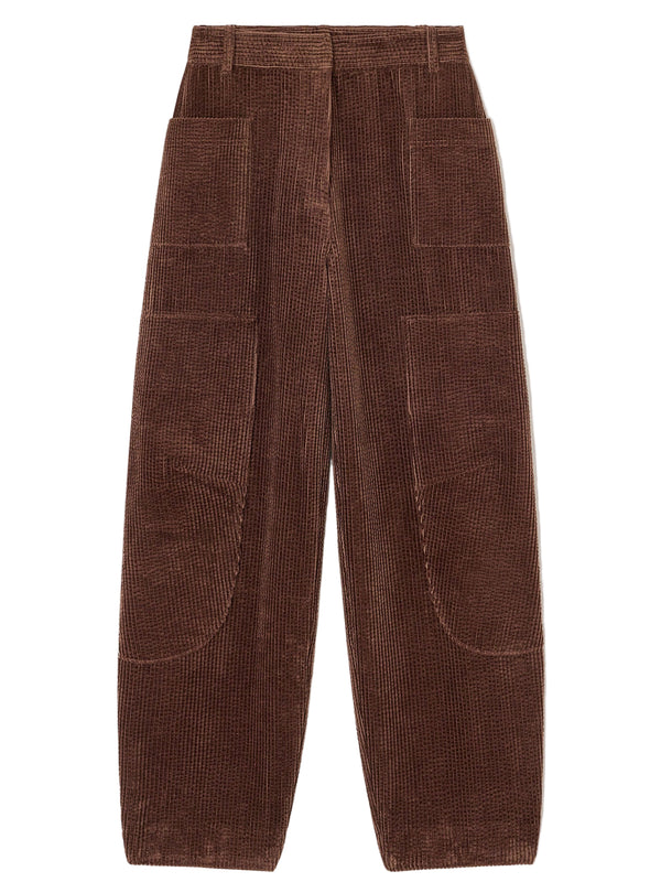 These curved corduroy trousers are the perfect piece to bring some interest into the outfit. The rich brown colour combined with the texture of seersucker corduroy makes any look pop!