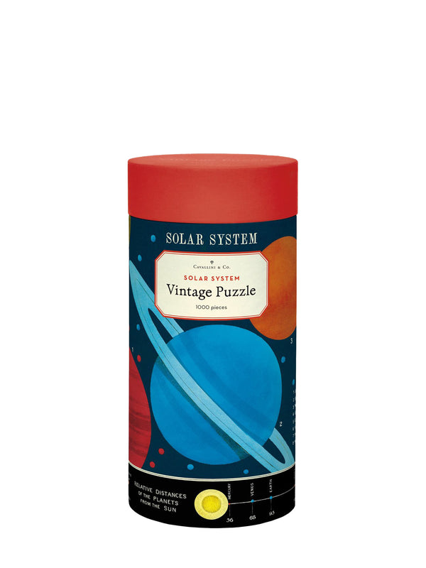 A quality 1000 piece jigsaw puzzle by Cavallini featuring vintage illustrations of solar system.