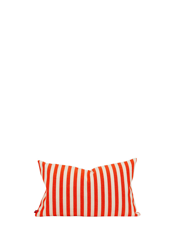 Small happy stripey cushion cover from cotton canvas in cheerful green on pink.
