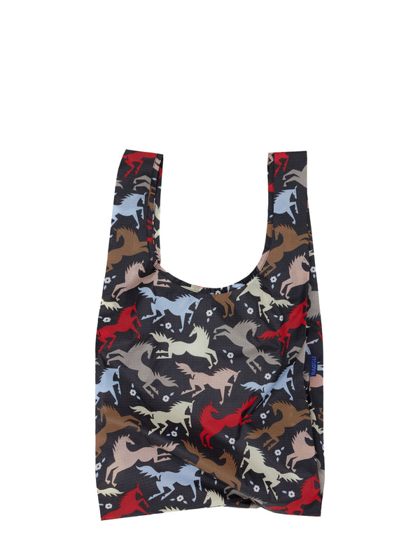 The Horse cut-outs print brings bold movement and energy to the classic BAGGU reusable bag. Silhouetted horses in rich tones of red, blue, tan and cream gallop across a dark background, giving the design a striking sense of motion. This is the bag that comes with you everywhere, ready to carry groceries, books, gym gear or whatever the day demands.