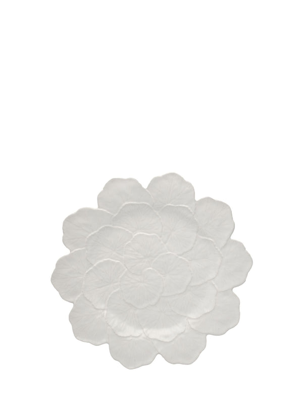 A sculptural charger plate shaped like layered geranium petals, finished in a crisp white glaze that suits both everyday dining and elevated table settings. The generous size makes it ideal as an underplate, serving piece or decorative base for centrepieces. A refined way to add texture, craftsmanship and timeless elegance to the table.