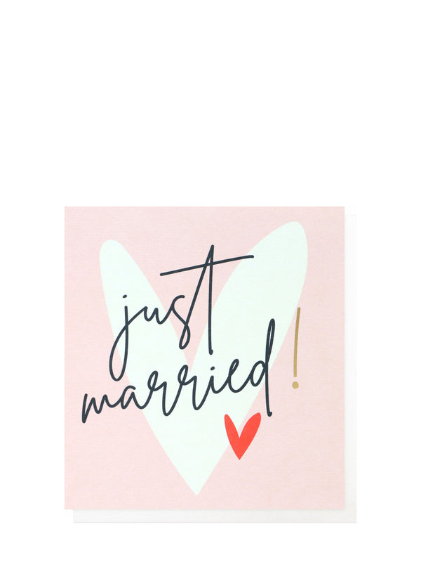 Cute light pink with a white love heart 'just married' wedding card features gold foil for that extra special touch. All of Caroline Gardner's cards are made in England, printed on board using a low chlorine pulp from sustainable forests and are 100% recyclable.