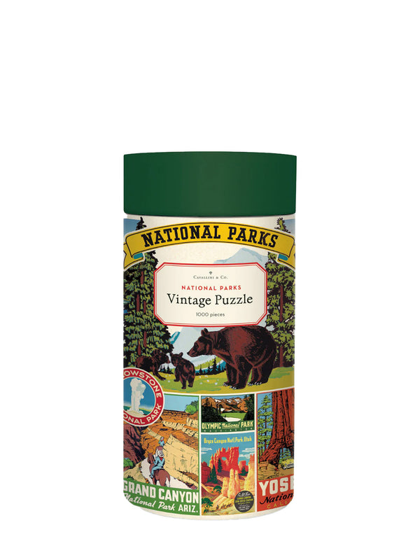 A quality 1000 piece jigsaw puzzle by Cavallini featuring vintage illustrations of US national parks.