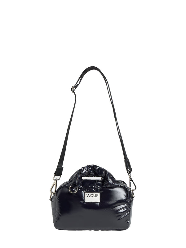 The Nuit bowling bag, made from 100% recycled fabrics, is designed to carry your phone, wallet, and other essentials with a shiny finish. It features a water-repellent surface, two padded top handles, a detachable and adjustable crossbody strap, a main zipped compartment, and an inner pocket to keep everything in place.