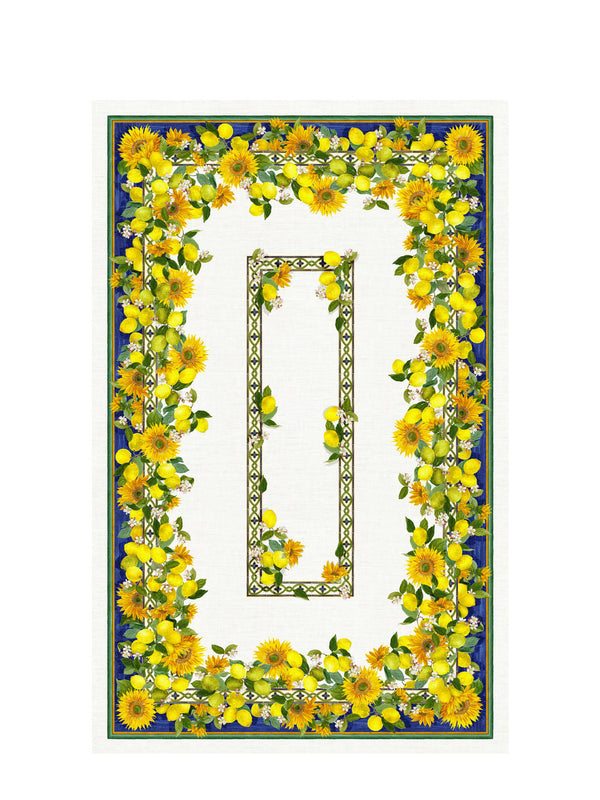 A celebration of sun-soaked Italian summers, this Tessitura Toscana Telerie tablecloth brings vibrant lemons and blooming sunflowers to the table in a richly detailed, ornamental frame.