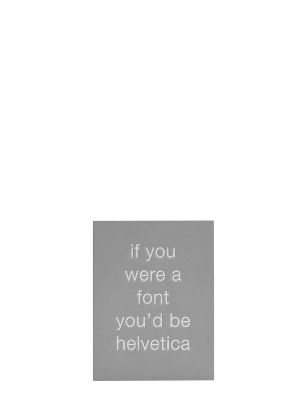 A mini greeting card with the text 'if you were a font you’d be helvetica' printed on it, in a simple white font, with a grey background. The card is shown with its envelope.