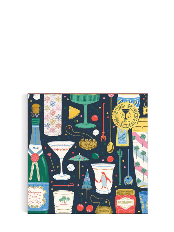 This puzzle features a charming collage of colorful cocktails and drinks with gold accented foil.