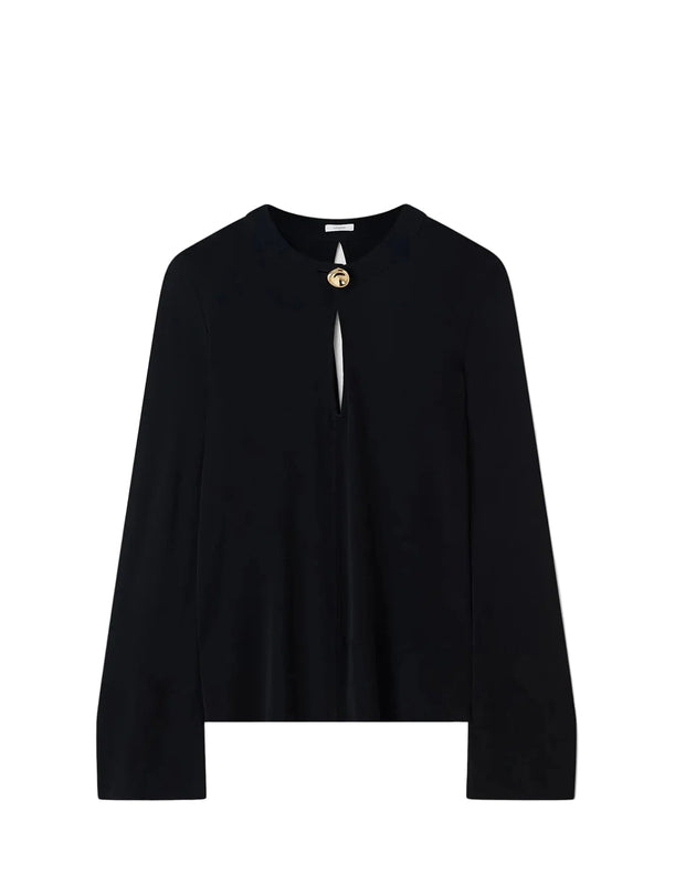 The Fabiola Fluid Jersey Blouse is a regular fit, long-sleeve design, crafted from a viscose blend. Its fluid jersey drapes elegantly for a sleek yet comfortable look. Thoughtful details include wide split cuffs and a keyhole opening finished with a gold-tone bean button for a subtle touch of shine.