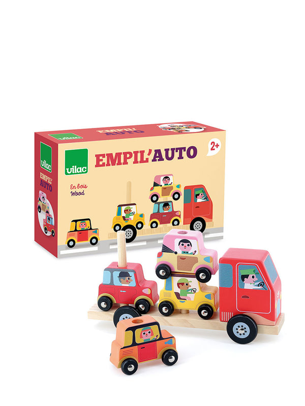 Discover this wooden educational game designed by Ingela P.Arrhenius. Your child will fall in love with the different wooden vehicles, the red truck, and the multiple possible combinations on the large trailer. Let's go for a trip to the city. The 4 wooden cars can be stacked on top of each other or used in free play by your child. Ready to hit the road?