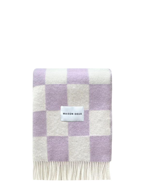 The Checkerboard Blanket Lilac White is jacquard-woven from 100% New Zealand wool with fringes on the short sides. A thick premium blanket that is mirror-inverted on the opposite side. Measuring 130 x 200 cm, it's big enough to let someone join you. It keeps you warm and upgrades your living room in a split second.