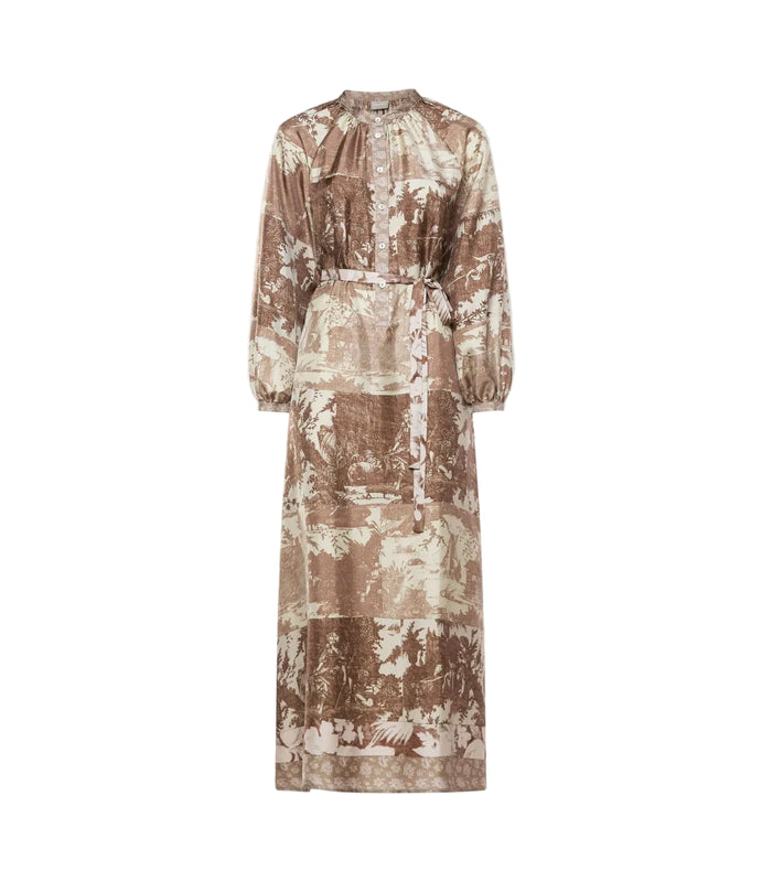 This enchanting long-sleeved maxi dress exudes an air of vintage romance with its intricate blue toile de Jouy pattern. Crafted from lightweight fabric, it features a gathered neckline and a cinched waist with a matching sash, evoking serene elegance. Pair with delicate sandals for a poetic summer ensemble.