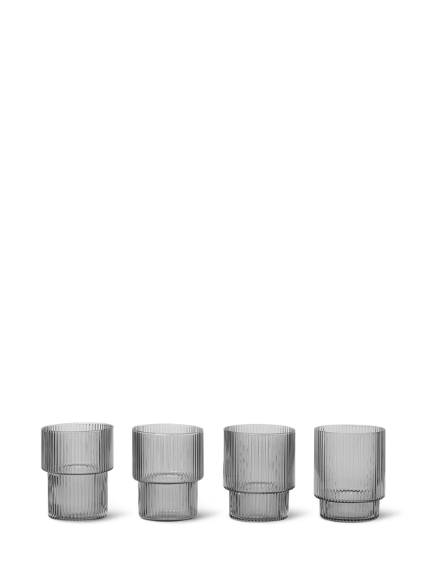 Mouth blown into the mould, this set of four tinted glasses features a beautiful rippled surface. The vertical ripples add a strong and sophisticated look and the varied geometric shapes create dynamic and energy between the glasses and function as a stackable design element. Elegant choice for a water glass, pair them with the matching carafe for a stylish set at breakfast, lunch or dinner. Also available in a clear glass version.