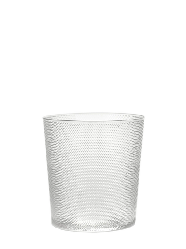 The round glass has a ribbed design that creates slightly frosted effect to the glass. The shape is generous: the glass is wide yet tall, which together with the ribbed surface's good grip, makes it a true pleasure to use. Charming with etheral appeal, it's nevertheless great for daily use.
