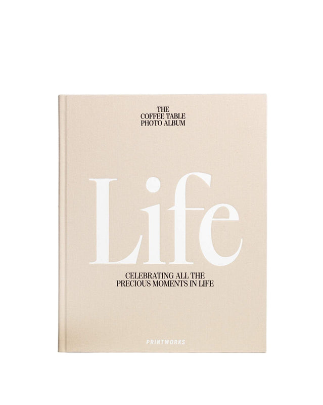 Discover this beautiful 'Life' Coffee Table Photo Album featuring an elegant beige cloth cover with white text. Inside, you'll find 30 pages of high-quality white photo paper, allowing you to attach your photos easily using our stickers or photo corners.
