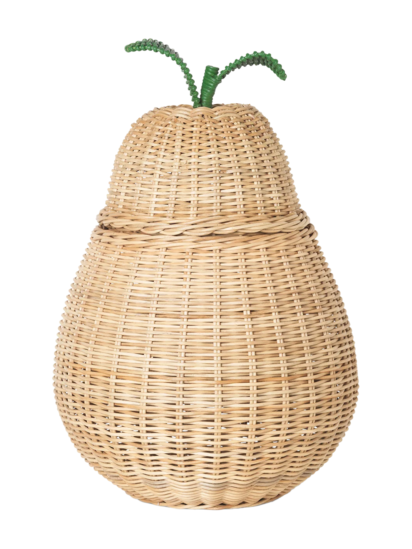 Braided in the shape of a fruity pear this design gives you a lovely storage solution for the kids’ room. Use it for bibs and bobs, bricks, or secrets – and create a fun little fruit basket in the kids’ room as you combine it with the other baskets. The natural colour of the rattan has calming effect on its surroundings and small green detail is a fun contrast.