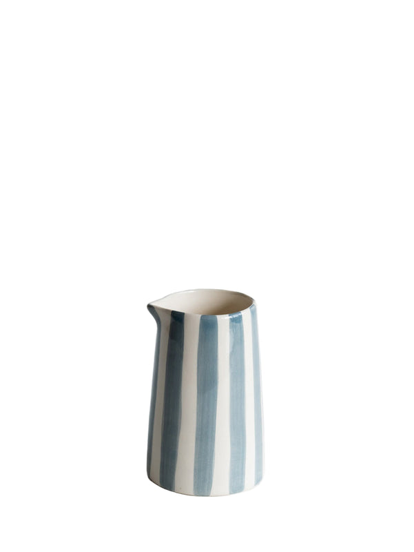 Creamer by Musango in candy vertical stripe in dove grey. Holds about 350ml and stands approximately 12cm tall. Handmade and painted in Portugal. Dishwasher safe.